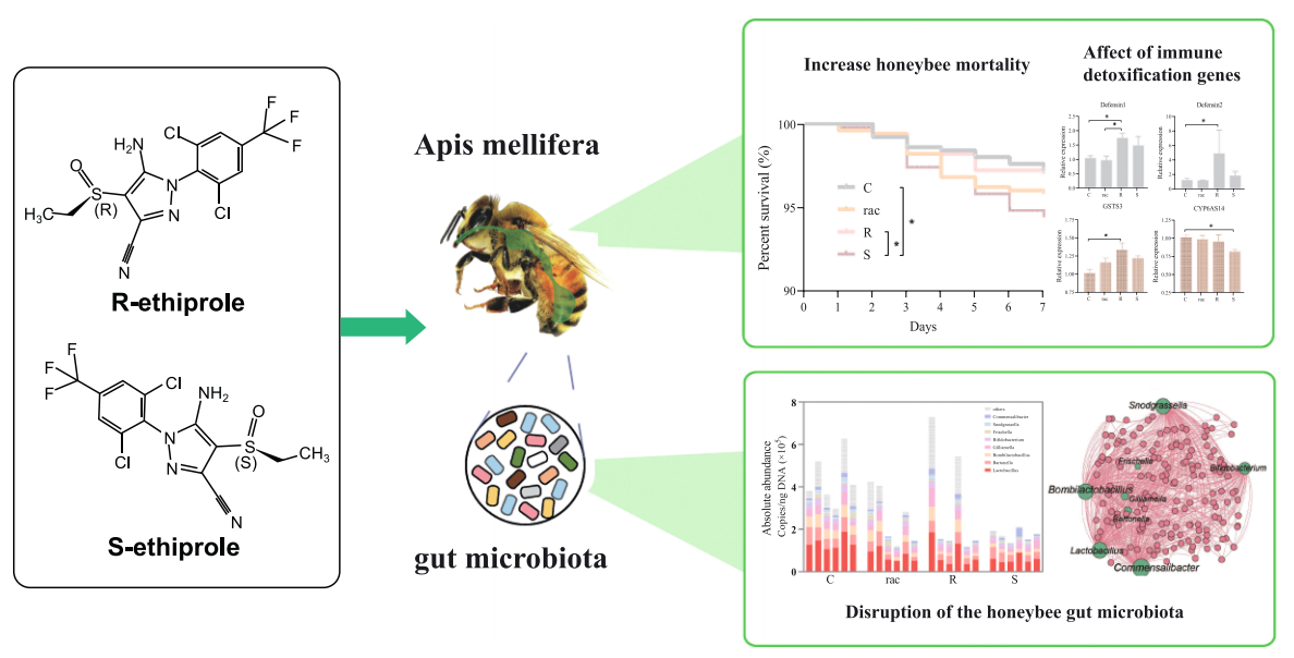 蜜蜂是重要的傳粉者,在覓食過(guò)程中容易受到外部病原體和農(nóng)藥的影響。手性乙蟲腈作為一種重要的農(nóng)藥,廣泛用于農(nóng)業(yè)生產(chǎn),但其對(duì)蜜蜂的副作用尚不清楚。該研究分析了三種形式的乙蟲腈(rac-乙蟲腈、R-乙蟲腈和S-乙蟲腈)對(duì)蜜蜂及其腸道微生物的毒性。結(jié)果表明,乙蟲腈對(duì)映體對(duì)傳粉者具有潛在的毒性,并為農(nóng)業(yè)中農(nóng)藥的安全合理使用提供了依據(jù)。