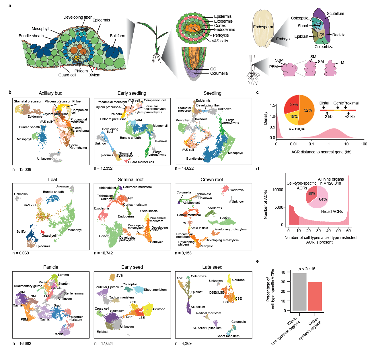 ② 該研究構(gòu)建了一個全面的水稻(Oryza sativa)染色質(zhì)可及性單細胞圖譜,整合了來自103,911個細胞核、代表126種離散細胞狀態(tài)的九個不同器官的數(shù)據(jù)。通過比較基因組學,分析了水稻與另外四種禾本科植物(玉米?Zea mays、高粱?Sorghum bicolor、黍?Panicum miliaceum?和?Urochloa fusca)中57,552個細胞核的細胞類型分辨染色質(zhì)可及性之間的差異。