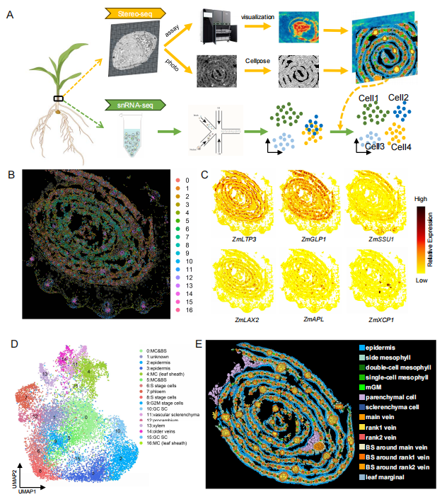 單細胞核&空間轉(zhuǎn)錄組:12日齡玉米幼苗基部莖段葉原基(P3-P6),通過Cellpose 2.0識別細胞壁輪廓,提取14,037個空間單細胞轉(zhuǎn)錄組