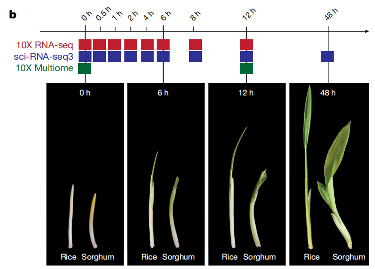 單細胞核轉(zhuǎn)錄組:水稻和高粱幼苗暗生長5天后,在光周期(12h光/12h暗)中采集0h(暗)、0.5h、1h、2h、4h、6h、8h、12h、48h共9個時間點的地上組織。總計水稻190,569個核、高粱265,701個核。