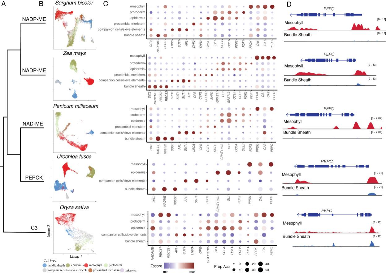 ② 該研究使用單細胞sci-ATAC-seq來鑒定與C4酶相關(guān)的特異細胞類型的可及染色質(zhì)區(qū)域(ACRs),研究涵蓋了五種不同的禾本科植物,包括四種C4植物和一種C3植物。其中,C4植物分屬三種不同的光合亞型:玉米(Zea mays)和高粱(Sorghum bicolor)屬于NADP-ME亞型;黍(Panicum miliaceum)屬于NAD-ME亞型;Urochloa fusca屬于PEPCK亞型;C3植物水稻(Oryza sativa)