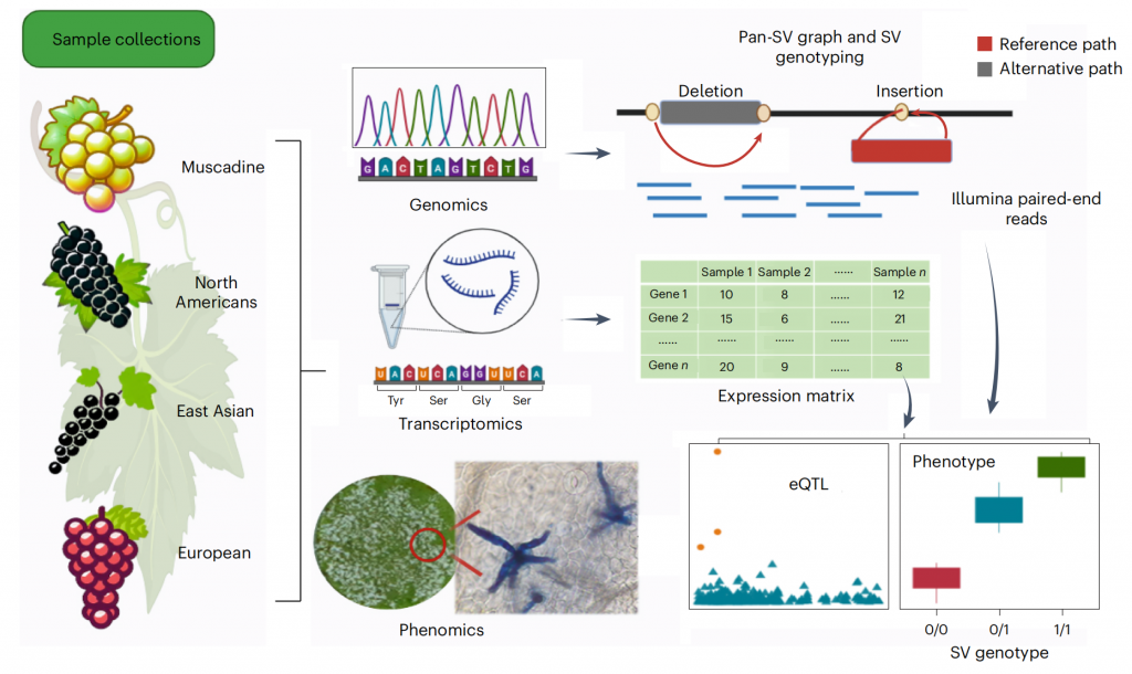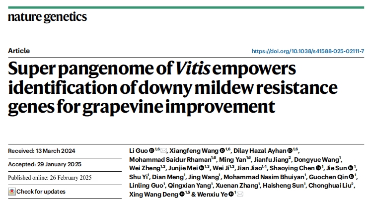 2025年02月26日,濰坊現代農業(yè)山東省實驗室、北京大學現代農業(yè)研究院葉文秀研究員和郭立研究員團隊在國際期刊《自然-遺傳學(Nature Genetics)》上在線發(fā)表了題為Super pangenome of Vitis?empowers identification of downy mildew resistance genes for grapevine improvement的研究成果。作為葡萄科研領域里程碑式的重大突破,繪制了涵蓋葡萄屬的歐亞、北美和東亞世界三大種群的72個葡萄種質材料的單倍型超級泛基因組圖譜,揭示葡萄屬豐富遺傳多樣性和雜交歷史,基于葡萄多組學數據,挖掘到葡萄霜霉病抗性相關遺傳變異和抗病基因,加速葡萄精準分子育種,開啟葡萄種質創(chuàng)新和利用新時代。百邁客生物為該研究提供了基因組、hic、轉錄組等測序服務。