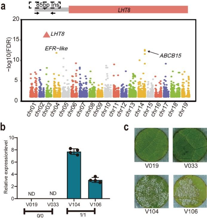 最后,該研究使用葡萄結構變異圖譜和基于霞多麗完整基因組序列,構建了涵蓋歐、亞、美三大種群的圖形泛基因組。基于該圖形泛基因組,該研究對113個葡萄樣本的霜霉病抗性表型、氣孔表型以及霜霉病侵染轉錄組數據進行了基因組變異的eQTL分析(圖5),鑒定出63個SV-eQTL和1,808個SNP-eQTL與葡萄抗霜霉病顯著相關。在63個與霜霉病抗性密切相關的SV的輔助下,該研究定位到一個氨基酸轉運蛋白基因VvLHT8。進一步的分子功能實驗發(fā)現VvLHT8可能通過負調控葡萄水楊酸合成和氣孔免疫反應進而抑制葡萄抗病性,證實了高質量泛基因組輔助的多組學關聯分析在作物重要農藝性狀分子標記開發(fā)及功能基因挖掘中的高效性。該研究構建的葡萄屬超級泛基因組不僅加深了對葡萄生物進化和育種改良的理解,也為精準改良葡萄抗病性和多樣性提供了重要的科學基礎。