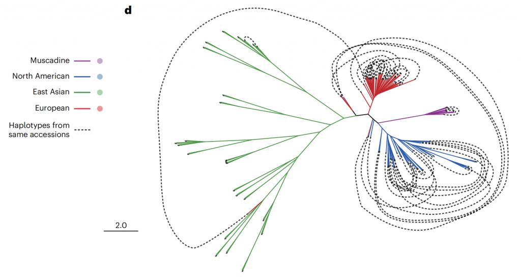 鑒于葡萄基因組因頻繁雜交而具有的高度雜合性,單倍型基因組不僅能精確解析雜合區(qū)域序列,而且對分析葡萄的育種歷史也至關重要。該研究構建了單倍型系統(tǒng)發(fā)育進化樹,揭示了葡萄屬植物復雜的育種歷史和豐富的遺傳多樣性。結果顯示,北美和歐洲品種存在較多內部雜交,而東亞品種的內部雜交較少,跨大洲雜交事件有限(圖2)。特別是東亞葡萄極少被開發(fā)的遺傳多樣性,表明了其潛在的巨大育種價值。此次發(fā)布的東亞野生葡萄基因組為葡萄遺傳育種研究提供了強有力的資源支持。