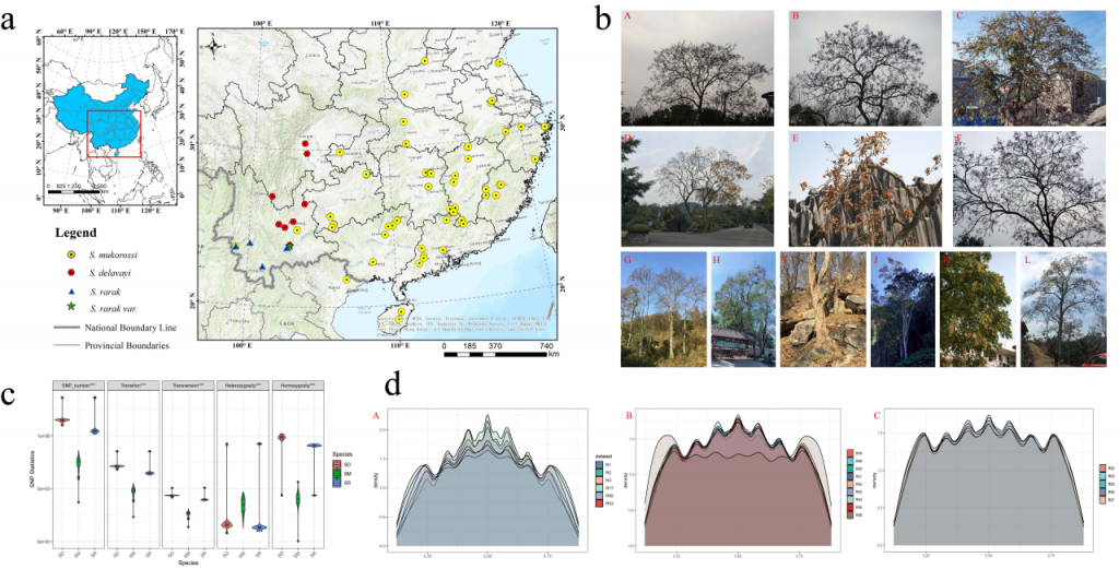 圖1?無患子屬種質(zhì)分布及單核苷酸多態(tài)性(SNP)?統(tǒng)計(jì)分析