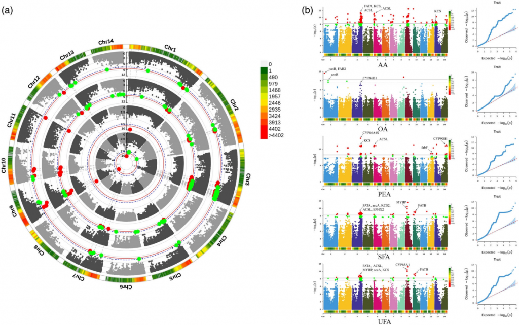 鎖定油脂合成關(guān)鍵位點(diǎn):通過全基因組關(guān)聯(lián)分析(GWAS),團(tuán)隊(duì)識(shí)別出影響種仁油脂組成的多個(gè)關(guān)鍵基因(如ACSL、FAD2、FAB2等),為高品質(zhì)油料品種的選育提供了精準(zhǔn)靶點(diǎn)。