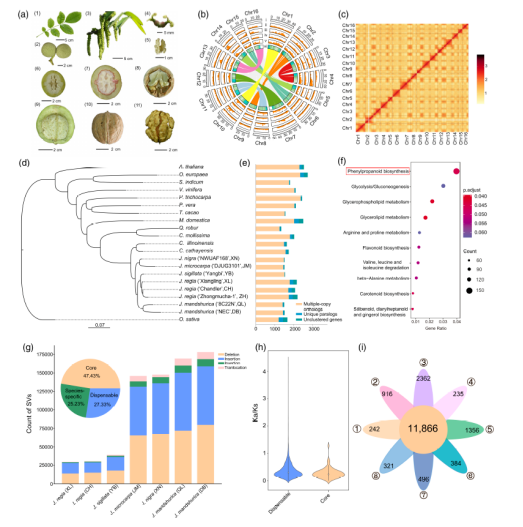 該研究組裝注釋了核桃品種“香玲”的高質(zhì)量基因組,并構(gòu)建了涵蓋八個胡桃屬物種的圖形結(jié)構(gòu)泛基因組,以揭示基因組水平上的遺傳變異。重新測序了285份樣本,揭示了其群體基因組景觀變異圖譜。通過全基因組關(guān)聯(lián)研究(GWAS),研究發(fā)現(xiàn)了19個與核桃馴化和改良過程中受到選擇的268多個位點相關(guān)的基因座。