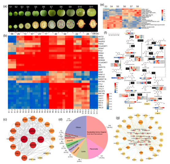 圖2-核桃果殼/內(nèi)果皮十一個發(fā)育階段基因轉(zhuǎn)錄調(diào)控網(wǎng)絡(luò)及動態(tài)形態(tài)變化