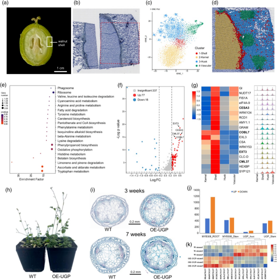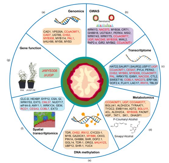 通過對十一個發(fā)育階段的轉(zhuǎn)錄組學、代謝組學、DNA甲基化和空間轉(zhuǎn)錄組學等多組學分析,揭示了多個與次生細胞生物合成和木質(zhì)素積累相關(guān)的候選基因,例如UGP、MYB308、MYB83、NAC043、NAC073、CCoAOMT1、CCoAOMT7、CHS2、CESA7、LAC7、COBL4和IRX12。在擬南芥(Arabidopsis thaliana)中過表達JrUGP和JrMYB308驗證了它們在木質(zhì)素生物合成和細胞壁加厚中的作用。