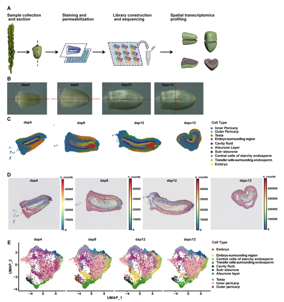 小麥(Triticum aestivum L.)是全球三大主糧作物之一,種植面積約2.3億公頃,其產(chǎn)量提升對(duì)保障全球糧食安全與營(yíng)養(yǎng)供給至關(guān)重要。小麥籽粒主要由三部分組成:二倍體胚、三倍體胚乳及果皮(種皮)。這些組織在發(fā)育過程中表現(xiàn)出顯著的基因表達(dá)時(shí)空特異性,形成功能分化的區(qū)室化結(jié)構(gòu)。盡管這些組織在細(xì)胞類型和生理功能上存在明顯差異,但它們通過協(xié)同調(diào)控構(gòu)建了獨(dú)特的籽粒發(fā)育微環(huán)境,共同決定籽粒的最終表型。然而,目前對(duì)籽粒細(xì)胞類型的認(rèn)知仍主要依賴于形態(tài)學(xué)觀察和少量標(biāo)記基因的表達(dá)分析,常規(guī)轉(zhuǎn)錄組數(shù)據(jù)因缺乏空間分辨率,極大限制了對(duì)籽粒發(fā)育調(diào)控機(jī)制的深入解析及關(guān)鍵功能基因的挖掘。