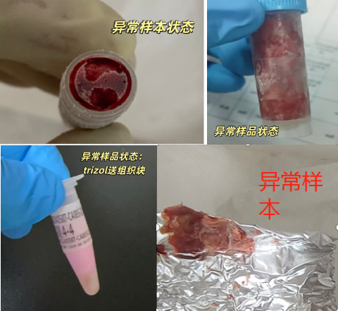 7)凍融組織: 組織凍存后,一旦凍融,核酸降解概率大于 80%,幾乎不可能提取成功,此類組織不建議送樣。請各位老師送樣前注意組織保存狀態(tài), 確保組織未發(fā)生過凍融情況