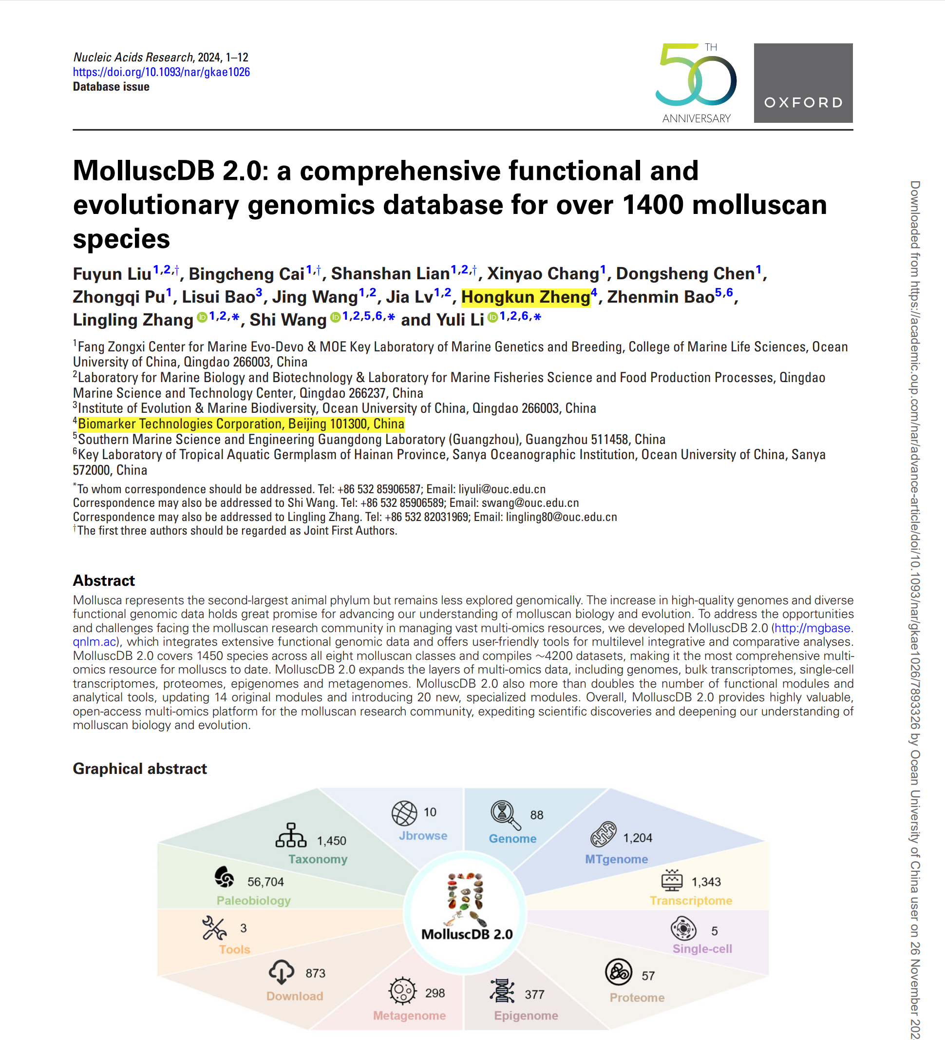軟體動(dòng)物(Mollusca)是動(dòng)物界第二大門類,也是最大的海洋動(dòng)物門類。軟體動(dòng)物起源于5億年前早寒武紀(jì),現(xiàn)存種類超過10萬(wàn)種,是進(jìn)化上最成功的無(wú)脊椎動(dòng)物群體之一。此外,許多軟體動(dòng)物也是重要水產(chǎn)經(jīng)濟(jì)物種,其占世界水產(chǎn)總產(chǎn)量高達(dá)27%。隨著軟體動(dòng)物基因組學(xué)迅速發(fā)展,取得的重要科學(xué)發(fā)現(xiàn)層出不窮,極大地提升了對(duì)動(dòng)物起源和適應(yīng)性演化的認(rèn)知深度。聯(lián)合國(guó)內(nèi)外優(yōu)勢(shì)機(jī)構(gòu),該研究團(tuán)隊(duì)于2021年發(fā)起了國(guó)際萬(wàn)種軟體動(dòng)物基因組計(jì)劃(M10K project),百邁客生物助力其構(gòu)建了軟體動(dòng)物綜合基因組數(shù)據(jù)庫(kù)MolluscDB(http://mgbase.qnlm.ac)。該數(shù)據(jù)庫(kù)整合了約1000份軟體動(dòng)物基因組和轉(zhuǎn)錄組學(xué)數(shù)據(jù),并提供了多種基因組比較分析工具。自正式上線運(yùn)行以來(lái),MolluscDB已吸引了來(lái)自70多個(gè)國(guó)家的近15000次訪問,成為全球范圍軟體動(dòng)物研究的重要組學(xué)資源中心。