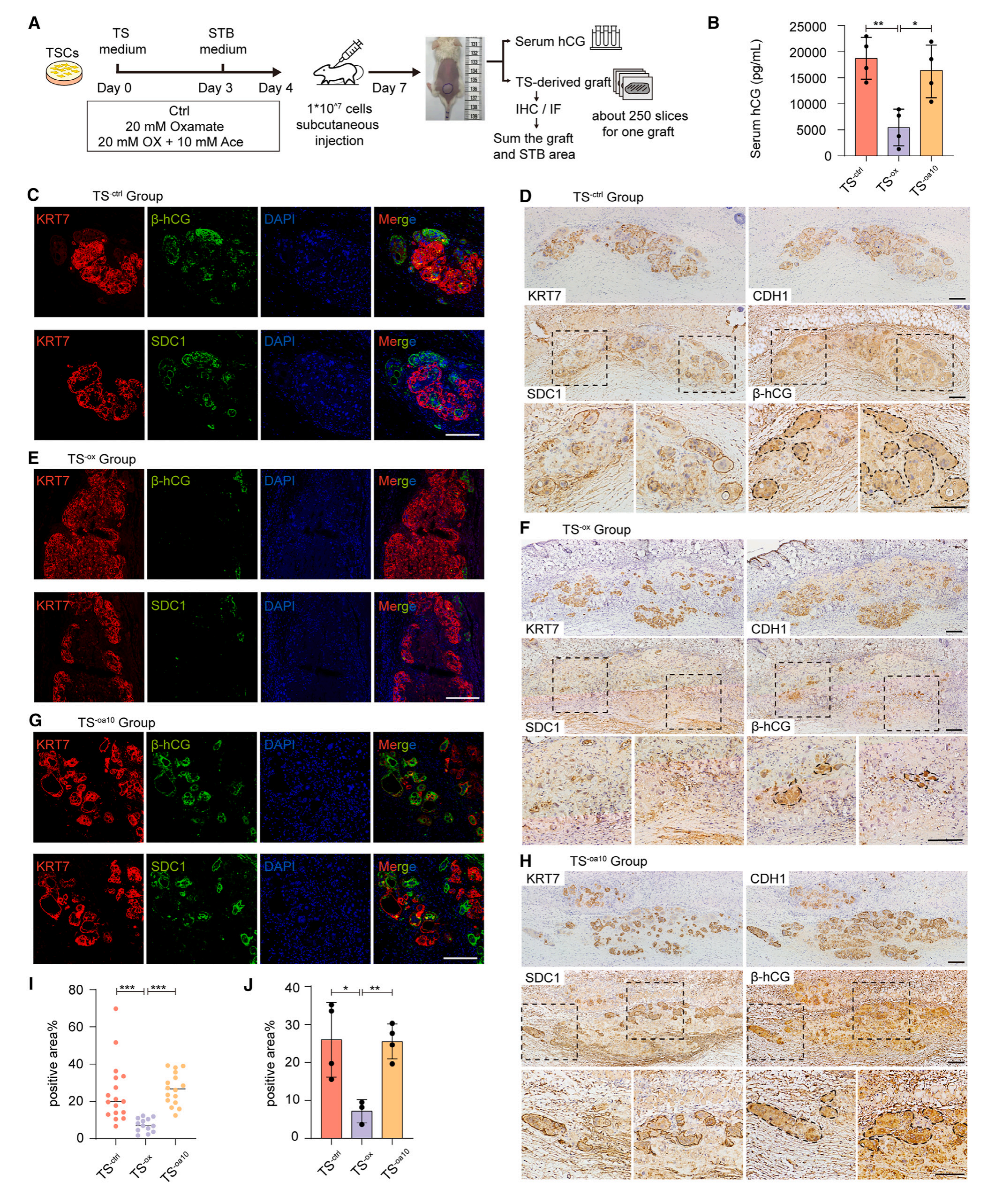 小鼠皮下注射對照hTSCs (TS-ctrl)、氨基甲酸酯處理hTSCs (TS-ox)和氨基甲酸酯和醋酸酯短暫處理hTSCs (TS-oa10)。隨意喂養(yǎng)NOD-SCID小鼠生長7天后,檢測血清hCG,并對移植的滋養(yǎng)細(xì)胞進(jìn)行免疫熒光和免疫組織化學(xué)染色,以確定體內(nèi)滋養(yǎng)細(xì)胞的合胞程度(圖7A)。然而,結(jié)果顯示STBs分泌到TS-ox小鼠血清中的hCG明顯低于TS – control小鼠(圖7B)。這與靶向數(shù)據(jù)一致,顯示在STB分化的第1天,乙酰輔酶A已經(jīng)開始上升,轉(zhuǎn)錄和表觀基因組數(shù)據(jù)顯示,STB分化的許多標(biāo)記已經(jīng)在第1天開始上升。因此,滋養(yǎng)層細(xì)胞在分化24小時(shí)內(nèi)就已經(jīng)進(jìn)入了STB的命運(yùn),在滋養(yǎng)層分化的這個(gè)時(shí)間點(diǎn)干擾糖酵解代謝可能對細(xì)胞命運(yùn)產(chǎn)生不可逆的影響,但不影響細(xì)胞活力。
