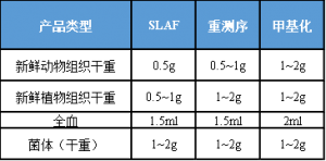 建議送樣量適用于95%的物種組織,少部分組織因胞內(nèi)核酸量較低,需適當(dāng)增加送樣量,比如植物果實、根等。送樣量過少或過多均不利于提取實驗,下限為建議量的一半,上限為建議量的3倍。隨著技術(shù)發(fā)展,當(dāng)前大部分產(chǎn)品建庫起始量較低,不需要太多組織,采樣量過多反而會造成速凍不徹底、提取取樣困難、凍融降解等危險。