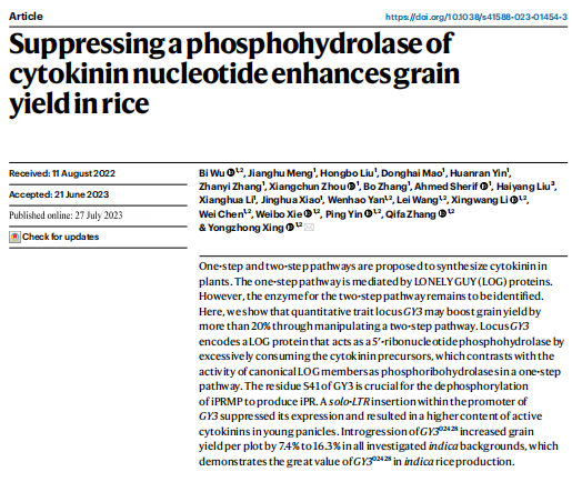作者通過秈稻品種特青和粳稻品種02428構(gòu)建高級遺傳群體克隆了產(chǎn)量相關(guān)基因GY3,其啟動子區(qū)域的反轉(zhuǎn)座子插入增強了啟動子區(qū)域的表觀修飾,降低GY3表達量,從而減少細胞分裂素合成前體底物的無效消耗,提高體內(nèi)活性的細胞分裂素含量,增加每穗粒數(shù)和谷物產(chǎn)量。GY3可作為后期秈稻高產(chǎn)育種的重要目標基因,推動產(chǎn)量提升。