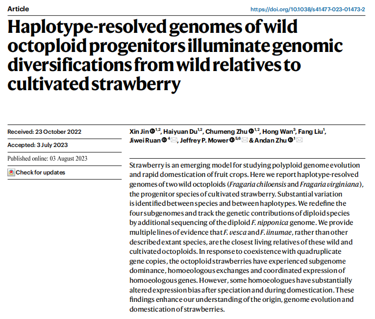該研究報道了兩個八倍體野生草莓智利草莓 (F. chiloensis)和弗州草莓 (F. virginiana)染色體水平的高質(zhì)量分型基因組組裝。探討了八倍體草莓在馴化過程中的同源偏向性表達分化,并鑒定到了一些重要的轉(zhuǎn)錄因子在馴化過程中發(fā)生了表達轉(zhuǎn)變。此研究深度解析了草莓的起源、基因組進化和馴化。(百邁客參與測序工作·)