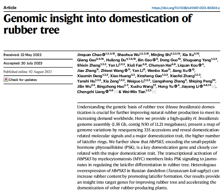 作者利用PacBio CLR+BioNano+Hi-C的方法構(gòu)建了橡膠樹參考基因組,結(jié)合127個栽培和208個野生品種重測序數(shù)據(jù)對其馴化的分子機制解析,同時通過208份橡膠樹種質(zhì)材料進行GWAS分析,鑒定到一個調(diào)控乳管數(shù)量的馴化基因。此研究將為后期橡膠樹的高產(chǎn)育種提供了分子基礎(chǔ)。