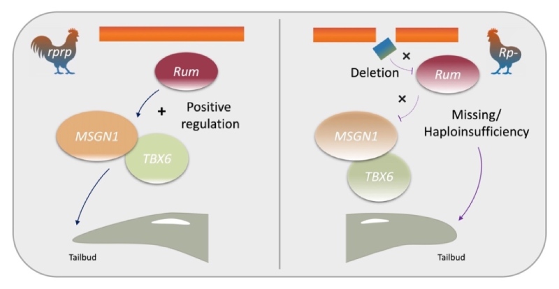 通過對包含家系內(nèi)特殊基因型個體的突變位點進行綜合篩選和分析后,一個4.2 kb的缺失被確定與瓢雞的無尾表型完全相關(guān)。在對致因區(qū)間內(nèi)的基因表達結(jié)果進行深入探究后,一個全新的基因Rum(長度大于22 kb,無內(nèi)含子),其表達呈現(xiàn)出無尾表達缺失,雜合子是顯性純合子表達量的一半的現(xiàn)象。深入研究發(fā)現(xiàn)Rum的表達具有胚胎特異性,研究人員認為Rum的表達缺失以及雜合子中的單倍劑量不足,使其無法正常調(diào)控MSGN1基因長轉(zhuǎn)錄本以及TBX6等基因的正常表達,進而使得尾部骨骼發(fā)育出現(xiàn)異常。