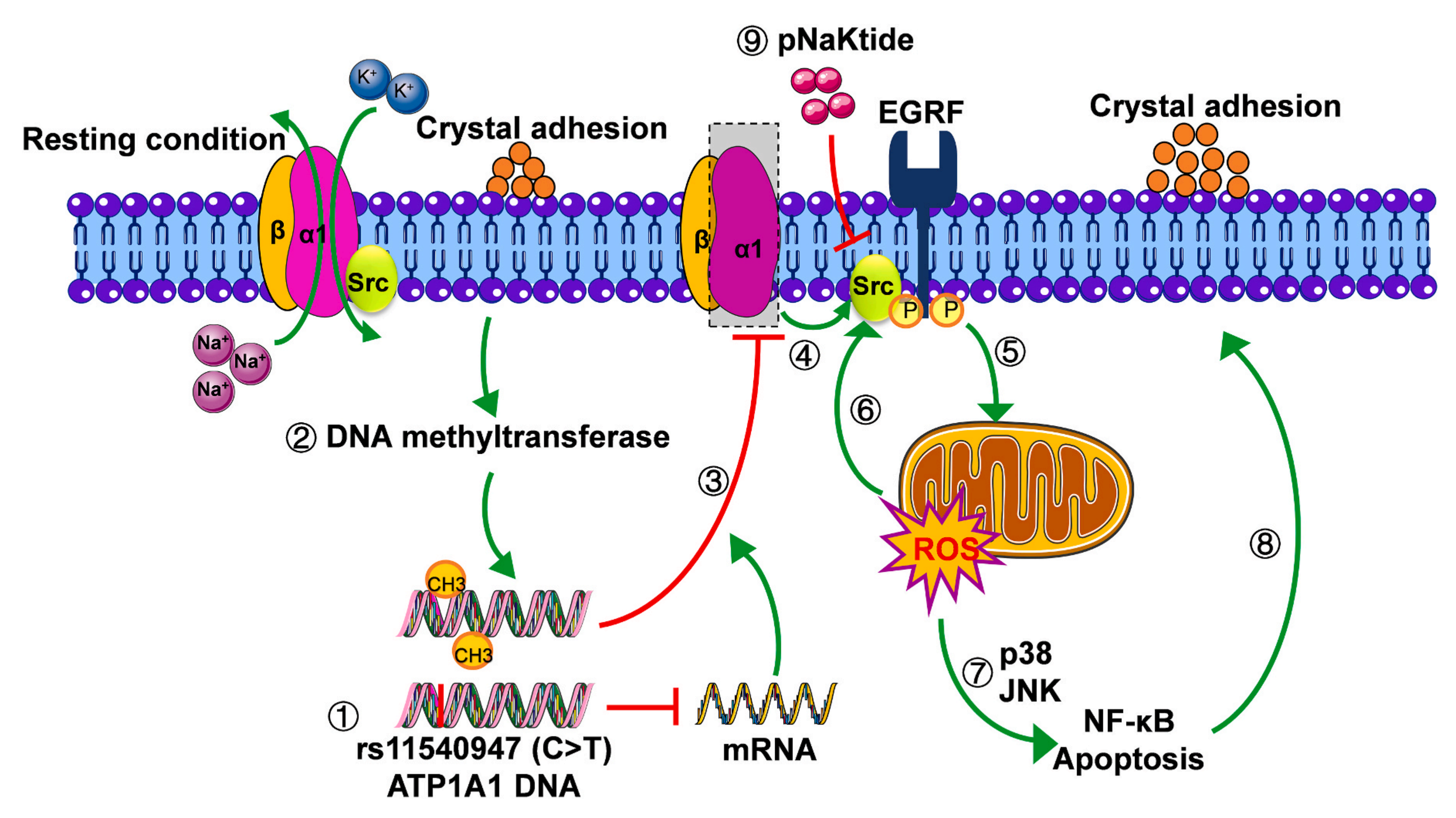 晶體與細胞的粘附是結(jié)石形成的關(guān)鍵過程,晶體沉積會損傷腎細胞,因此,作者研究了ATP1A1在晶體-細胞粘附中的作用。該研究觀察到用 Ad-hATP1A1 感染和用 pNaKtide 處理后,Ca2+濃度與對照組相比顯著降低,表明ATP1A1過表達和pNaKtide可以阻止晶體與細胞的粘附,從而保護細胞免受CaOx晶體誘導(dǎo)的損傷并減少腎結(jié)石的形成。DNA啟動子中CpG島的甲基化是基因沉默的常見機制,COM暴露后,DNA甲基轉(zhuǎn)移酶(DNMTs)的mRNA和蛋白質(zhì)水平均顯著升高,而用DNA甲基化抑制劑5Aza-2dc預(yù)處理HK2細胞再進行COM暴露處理后,ATP1A1表達量下調(diào);ATP1A1的蛋白水平也被逆轉(zhuǎn)。這些結(jié)果表明,改變的DNA甲基化參與了COM誘導(dǎo)的ATP1A1降低。