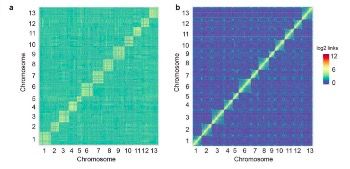 本研究使用Illumina HiSeq和PacBio Sequel測序平臺,用Hi-C、光學(xué)(BioNano Irys)和遺傳圖譜輔助,進(jìn)行雌性構(gòu)樹的基因組組裝。獲得染色體水平的高質(zhì)量構(gòu)樹基因組,其大小為386.93Mb,scaffold N50是29.48Mb,有99.25%(357.56Mb)的基因組被錨定在13條染色體上,Hi-C熱圖評估(見圖1)。一共預(yù)測了30,512個基因,98.09%與已知基因同源并且得到了功能上的注釋。