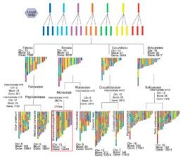 苦蕎與擬南芥、可可、大豆、葡萄、楊樹、馬鈴薯、番茄以及單子葉的水稻和玉米構(gòu)建系統(tǒng)發(fā)育進(jìn)化樹,見下圖。此外還進(jìn)行基因家族聚類分析,找出共同和特有的基因家族。