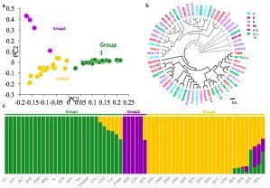 研究中對世界種質(zhì)資源庫的64份S. spontaneum材料進(jìn)行重測序,發(fā)現(xiàn)其核苷酸多態(tài)性(π)[0.00021±0.000002 ]遠(yuǎn)遠(yuǎn)低于其它克隆繁殖的作物,如馬鈴薯,木薯,葡萄和柑。通過PCA主成分分析及群體結(jié)構(gòu)分析發(fā)現(xiàn)64份材料分為3個群,這些群體也受到自然和地理起源推斷的64份種質(zhì)的系統(tǒng)發(fā)育關(guān)系的支持(見圖3),group1來源于菲律賓,印度尼西亞和巴布亞新幾內(nèi)亞;group2和group3來源于印度,巴基斯坦和伊朗。基因組倍性在三組中差異很大(從6x-16x)。通過系統(tǒng)進(jìn)化分析發(fā)現(xiàn),表明不同的倍性可能是從祖先獨(dú)立進(jìn)化而來的。