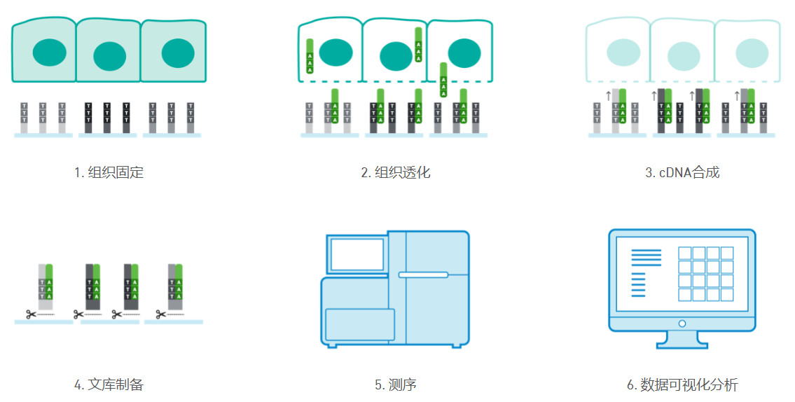 組織切片的細(xì)胞中會釋放出mRNA,遷移到每個spot的mRNA會被標(biāo)記上相應(yīng)的barcode序列,然后進(jìn)行文庫構(gòu)建并進(jìn)行測序。