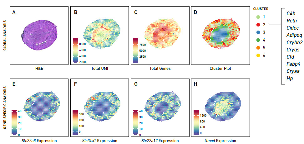 A代表組織切片的HE染色。B和C分別代表UMI計數(shù)和總基因計數(shù)與組織空間位置的圖像疊加。D代表基于總體差異表達(dá)基因的空間聚類結(jié)果,最右邊顯示了cluster2排名前10的特異表達(dá)基因。E、F、G、H分別代表了不同基因的空間mRNA表達(dá)。