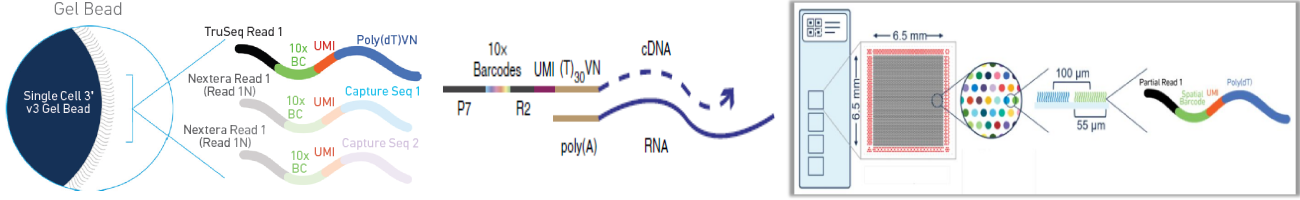 10x Genomics空間轉(zhuǎn)錄組用于文庫構(gòu)建的每張載玻片上有四個捕獲區(qū)域,每個捕獲區(qū)域的大小為6.5×6.5mm,包含5000個被條形碼標(biāo)記的點(diǎn)(barcoded spots),每個點(diǎn)的直徑為55 μm,點(diǎn)和點(diǎn)之間中心的距離為100 μm,并且每個點(diǎn)都有一個唯一的barcode序列。