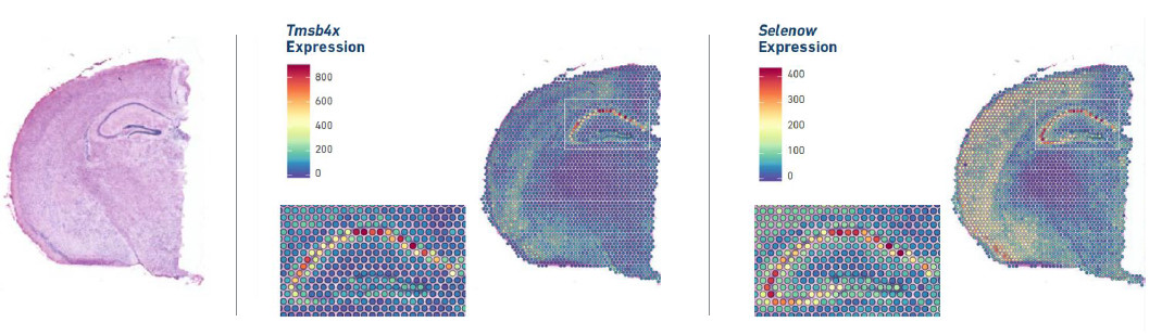 A代表組織切片的HE染色。B和C分別代表海馬組織的標(biāo)記基因Tmsb4x和Selenow基因的空間表達(dá)情況,結(jié)果顯示這兩個基因在海馬體中顯著高表達(dá),符合已知的基因表達(dá)模式