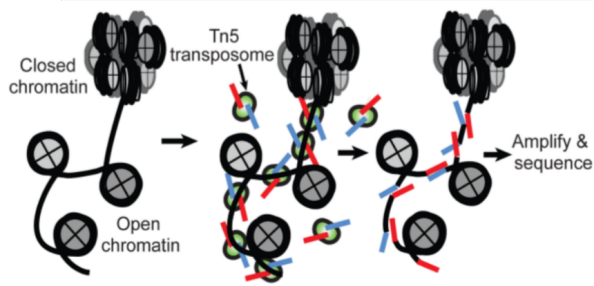 ATAC-seq(Assay for Transposase-Accessible Chromatin with highthroughput sequencing),基于高通量測(cè)序的染色質(zhì)轉(zhuǎn)座酶可接近性實(shí)驗(yàn)。在核小體連接致密的地方,轉(zhuǎn)座酶不能進(jìn)入,而松散的區(qū)域,轉(zhuǎn)座酶能夠進(jìn)入并切割下暴露的DNA區(qū)域,并同時(shí)連接上特異性的接頭,有接頭的DNA片段被分離出來,用于高通量測(cè)序。因此,ATAC-seq可以得是全基因度尺度上處于開放狀態(tài)的染色質(zhì)區(qū)域,并且通過分析染色質(zhì)開放區(qū)域的motif,可以獲得潛在的活躍轉(zhuǎn)錄因子及其靶基因。