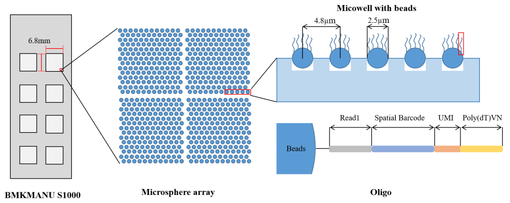 產(chǎn)品基于百創(chuàng)S1000亞細(xì)胞級(jí)空間轉(zhuǎn)錄組芯片與ONT測(cè)序平臺(tái)相結(jié)合,利用ONT平臺(tái)的超長(zhǎng)讀長(zhǎng)與S1000較傳統(tǒng)平臺(tái)而言更長(zhǎng)的Spatial Barcode(70bp),在后續(xù)的數(shù)據(jù)拆分無(wú)需依賴NGS的數(shù)據(jù)。除空間位置基因表達(dá)情況外還可以獲得基因結(jié)構(gòu)信息的空間位置。