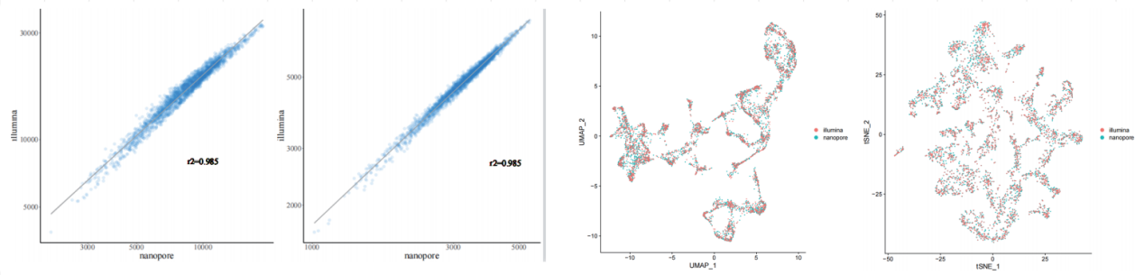 數(shù)據(jù)的相似性與準(zhǔn)確性進(jìn)行了展示與介紹,無(wú)論是二代與三代數(shù)據(jù)的UMI/Gene counts per spot的相關(guān)性還是tSEN/U-MAP的降維聚類(lèi),都顯示該產(chǎn)品具有非常高的準(zhǔn)確性。這充分說(shuō)明百創(chuàng)S1000全長(zhǎng)轉(zhuǎn)錄組產(chǎn)品完全可以獨(dú)立進(jìn)行數(shù)據(jù)的拆分與挖掘分析,無(wú)需依賴NGS數(shù)據(jù)的校正。